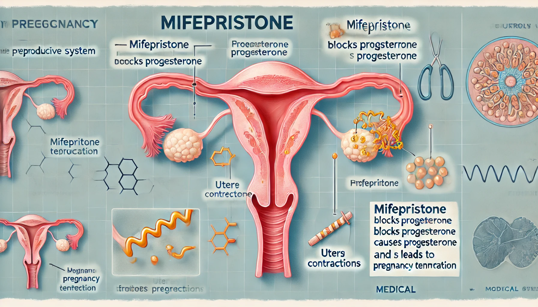 - Прогестерон – жүктілікті қолдайтын негізгі гормон. Мифепристон осы гормонның рецепторларына байланысып, оның әсерін тоқтатады.